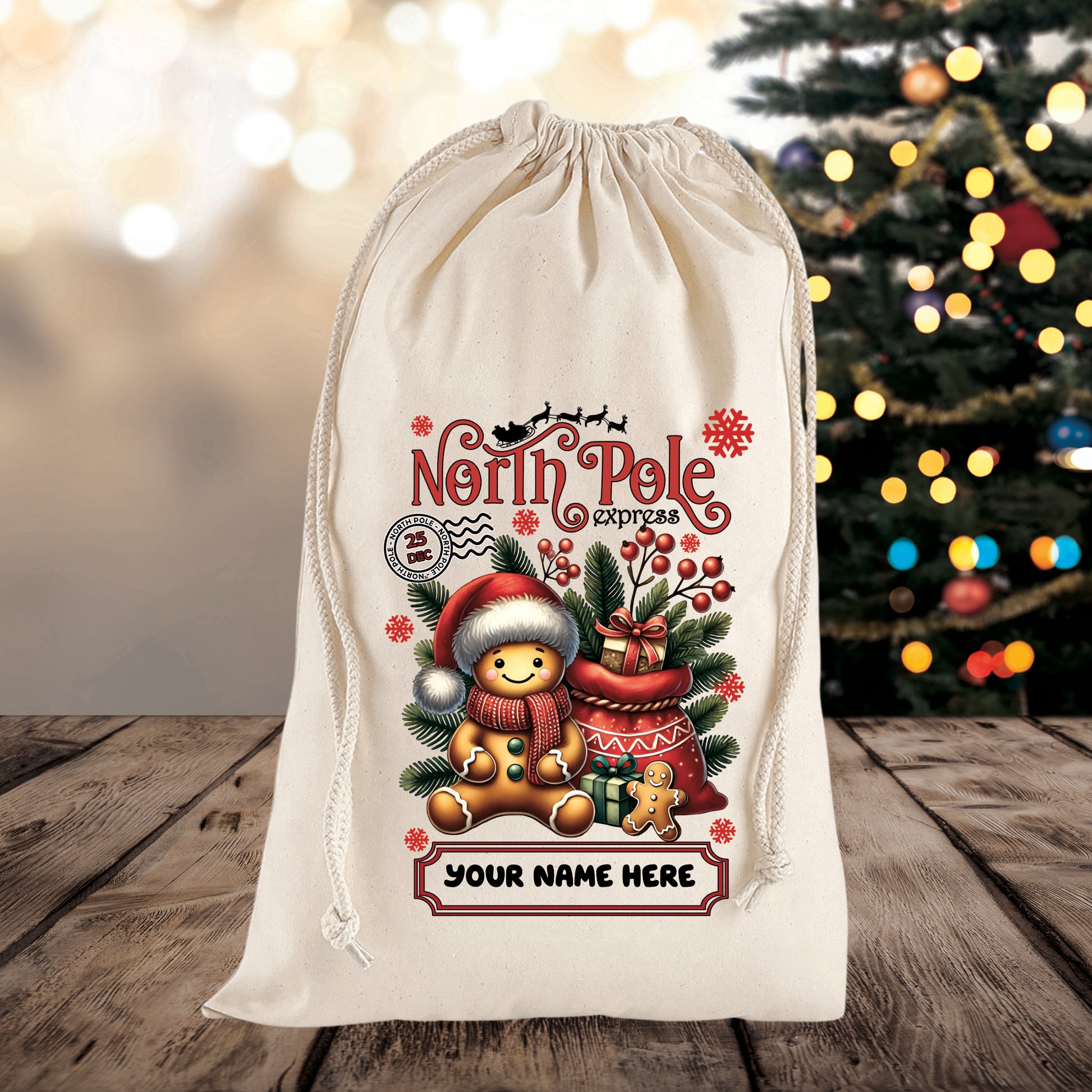 Our Personalised Premium Cotton Gingerbread Man Themed Christmas Sack is the perfect way to surprise your little one this festive season. Beautifully designed with a classic Gingerbread Man theme, each sack can be customised with any name, making it a keepsake they’ll treasure year after year.